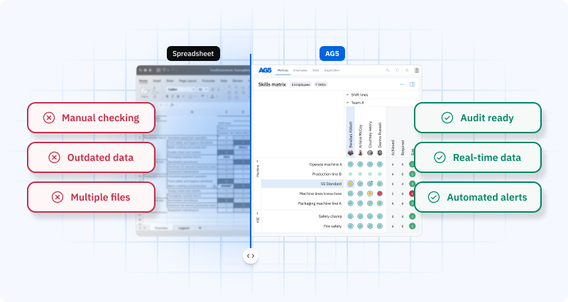An ISO 9001 auditor arrives unannounced. They ask to see the current qualification records for every operator on your highest-risk production line. In a spreadsheet system, that request triggers a two-hour search across multiple files, several of which haven’t been updated since last quarter. In AG5, it takes 30 seconds.