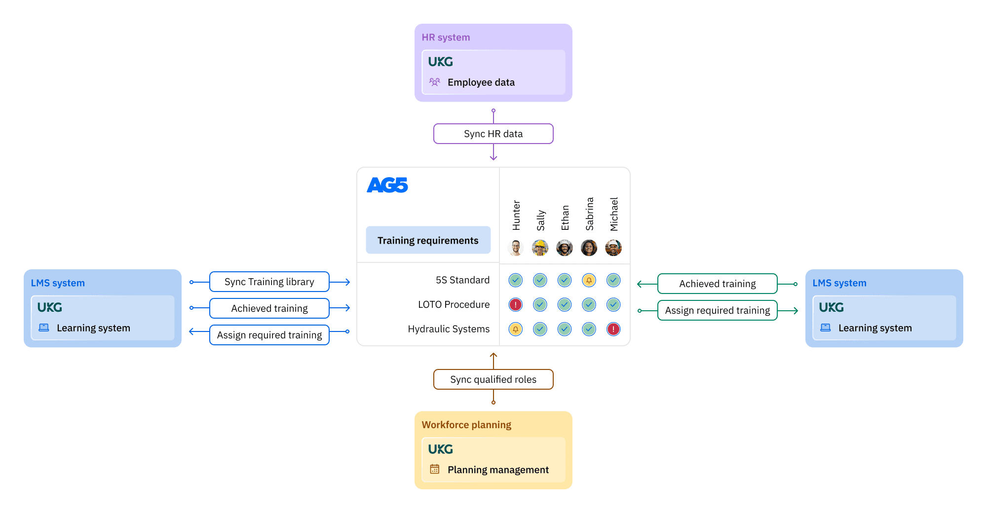 AG5 has developed three integrations with the UKG platform, enabling organizations to automate skills management of their frontline workforce.