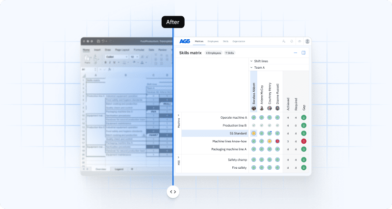 Maintaining evidence over time is crucial for compliance and continuous improvement. Historical records showing who was trained, when they were assessed, and what the results were protect you during audits and help analyze training effectiveness. AG5 supports this entire process with live skills matrices, up-to-date integrations, and dashboards that make gaps visible.