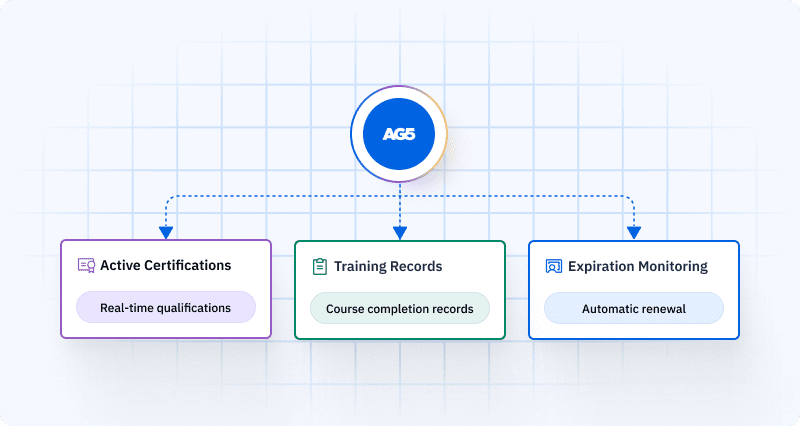 AG5 solves this through automated expiration alerts that monitor all certification dates and send notifications well before they expire. Managers get advance warning with enough time to schedule renewal training. As a result, continuous compliance gets maintained instead of scrambling to catch up.